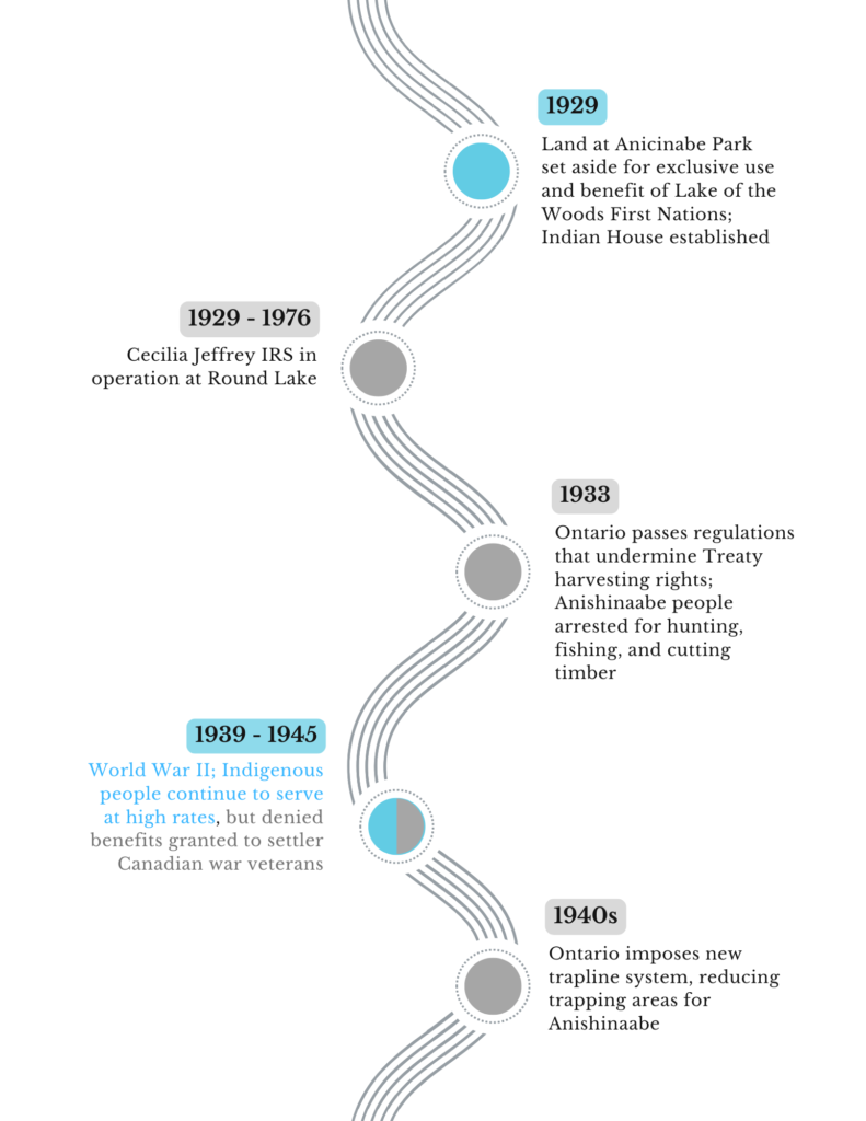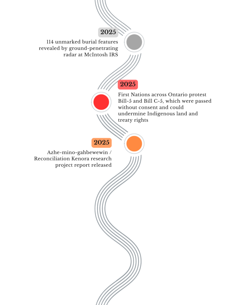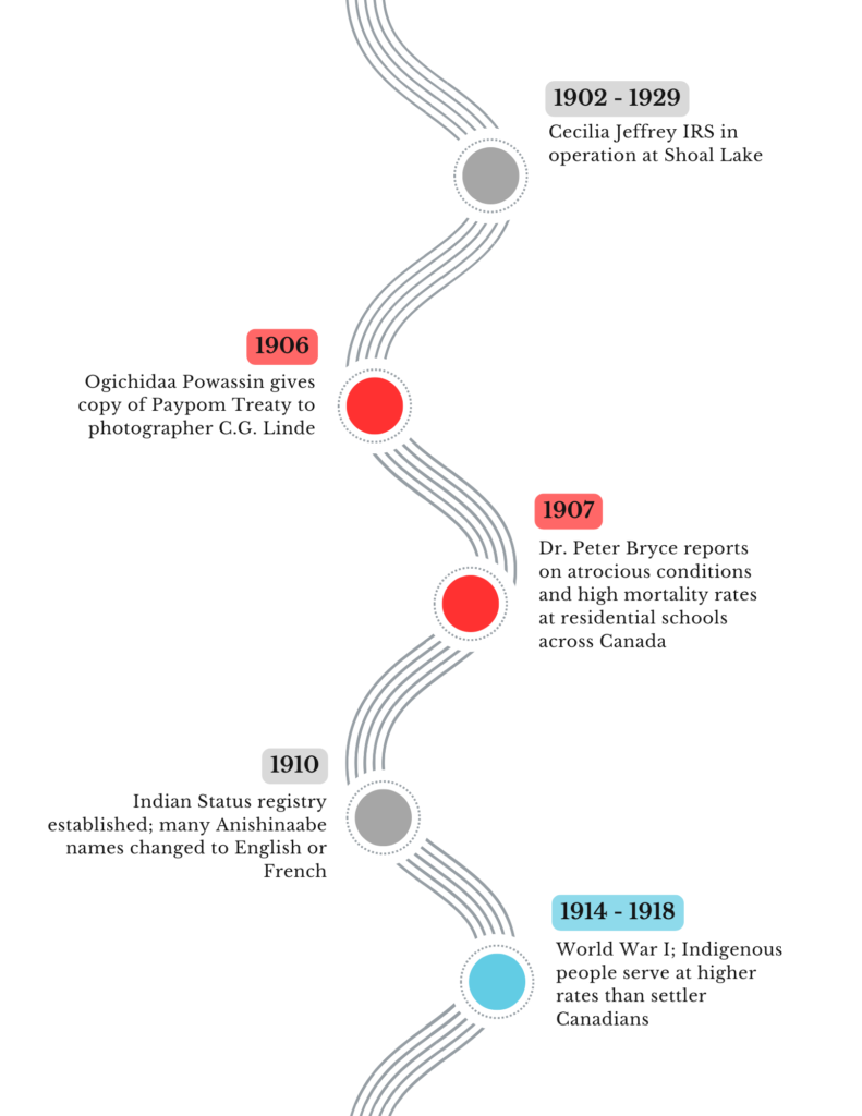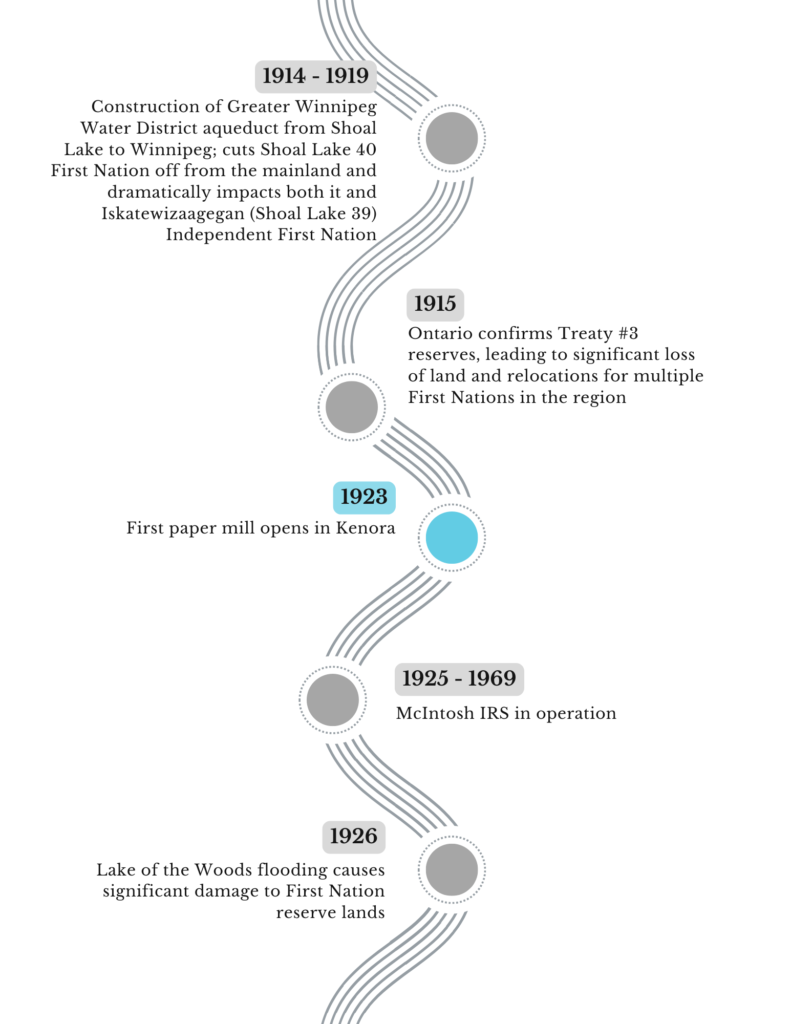 The early 20th century brought further trauma, as the Crown expropriated Indigenous lands and resources, and Indigenous families were torn apart. Treaty #3 had one of the highest concentrations of residential schools in Canada, including three in the vicinity of Kenora—Cecilia Jeffrey (1902-1976), McIntosh (1925-1969), and St. Mary’s (1897-1972)—where multiple generations of Anishinaabe and Métis children were abused, neglected, and, in some cases, died (TRC, 2015).