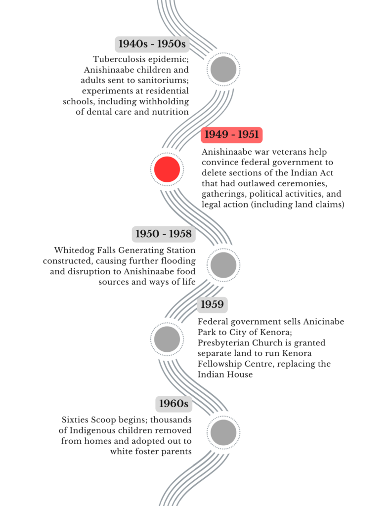 Meanwhile, white settlers controlled Kenora’s political institutions and monopolized the well-paid jobs in forestry, mining, tourism, and social services (Rutherford, 2020). While some settlers also faced hardship, many benefited—directly or indirectly—from the exploitation of Indigenous lands and resources, and their comfort, wealth, and security often came at Indigenous Peoples’ expense. Indigenous families, by contrast, were coping with the intergenerational impacts of colonial violence, systemic exclusion, and harsh living conditions.