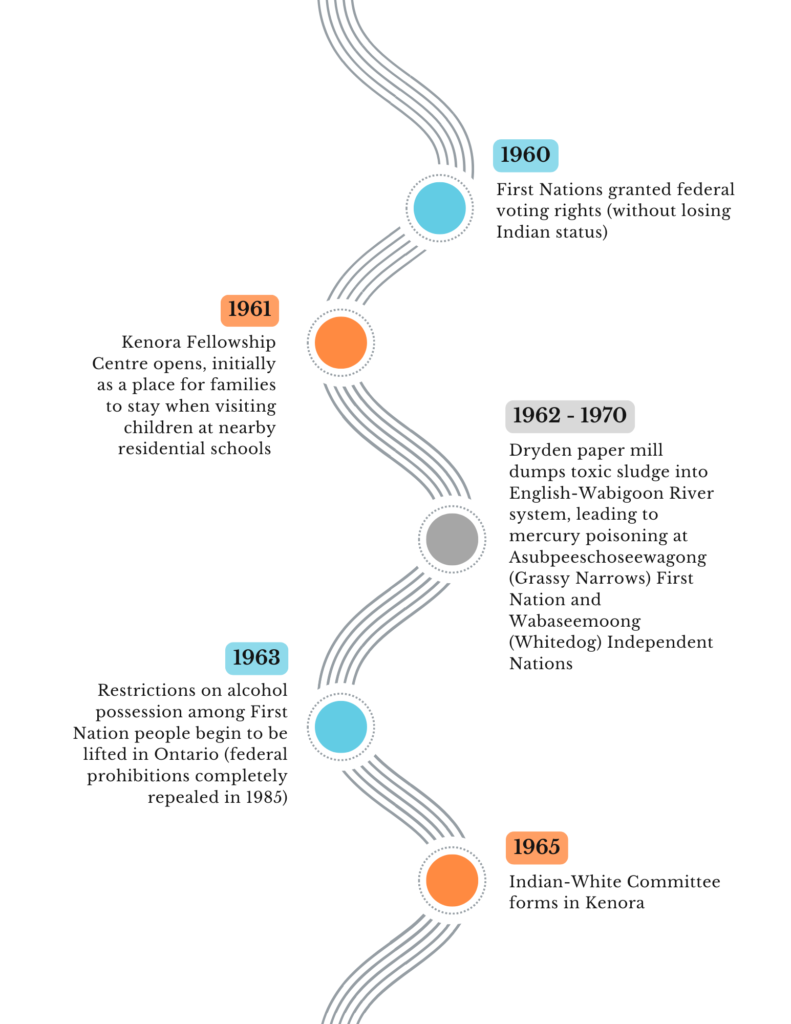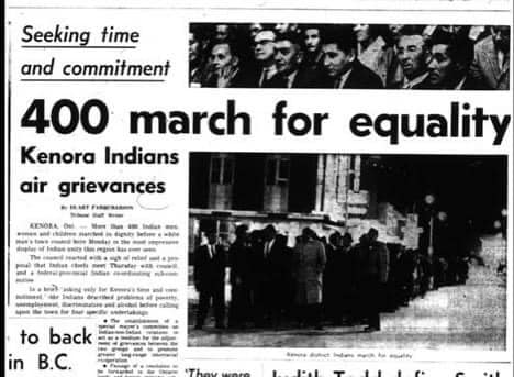 Yet, Anishinaabe and Métis people survived and resisted. In fact, Kenora became an epicentre of Indigenous activism. Amid the extreme inequality, in 1965, more than 400 members of nearby First Nations bussed into downtown Kenora and marched peacefully to protest racism and poverty—an event that came to be known as “Canada’s first civil rights march” (Rutherford, 2020). At that time: