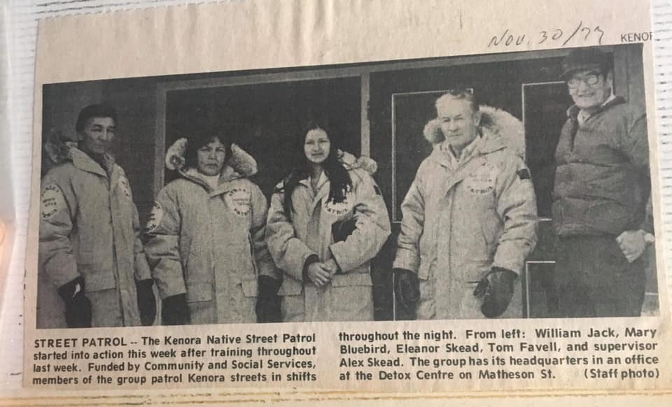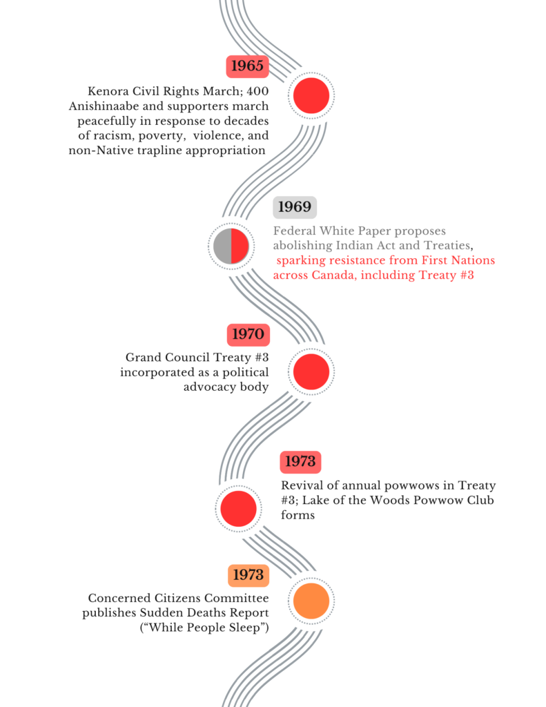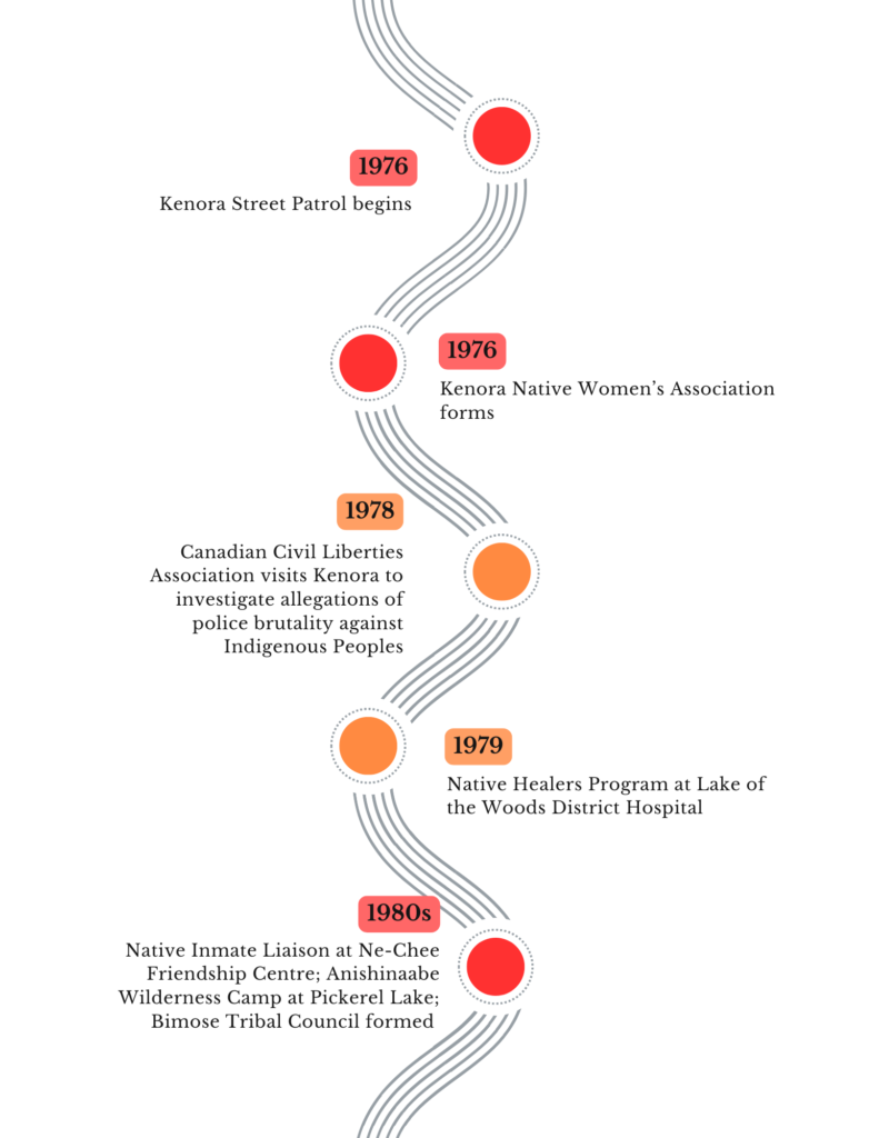 In 1973, the Concerned Citizens Committee—a subcommittee of the Kenora Social Planning Committee, which included Indigenous and non-Indigenous representatives of various organizations, social services, and government agencies—published the “Violent Deaths Report” (also known as “While People Sleep”). It highlighted the high rate of sudden, “unnatural” deaths among Indigenous people in Kenora (Rutherford, 2020: 87) and recommended more funding for social services, housing, mobile clinics, a detox centre, better police training, recreational facilities on reserve, increased Indigenous participation and control, respect for Indigenous culture, and “major educational efforts to improve white attitudes toward native people” (Concerned Citizens Committee, 1973: 21-22). That fall, the Ojibwa Warriors Society (OWS), led by Louis Cameron (Wabaseemoong), staged a 36-hour sit-in at the Department of Indian Affairs office, calling for “greater economic autonomy for local First Nations, government action on mercury contamination, and an end to the physical brutality, discrimination, and racism they experienced in Kenora” (Rutherford, 2020: 103).