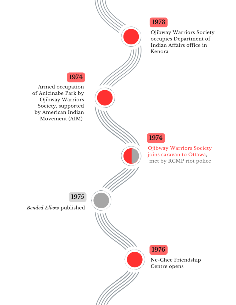 In 1974, with these issues unresolved, the OWS organized a 39-day armed occupation of Anicinabe Park to draw attention to the land question, ongoing colonial violence, and Indigenous Peoples’ dire socioeconomic conditions (Dunk, 2003). They asserted that the federal government had sold the 14-acre park to the City of Kenora without the First Nations’ consent, and called for better housing, education, and health care, and an end to police brutality. In response, a Kenora nurse published the pamphlet Bended Elbow, which blamed Indigenous Peoples’ social problems on their own “irresponsible” behaviour and claimed that white taxpayers were the true victims of “discrimination” (Jacobsen, 1975). The Kenora mayor blamed the federal and provincial governments, and said he hoped the demonstration would lead to positive change for Indigenous Peoples. Eventually, the Ontario premier agreed to meet with Grand Council Treaty #3 to develop a framework for discussions around land disputes, harvesting rights, and conservation. The OWS ended the occupation when weapons charges were dropped, settler governments said they would study the OWS recommendations, and Grand Council Treaty #3 said it would file a land claim for Anicinabe Park (Rutherford, 2020).