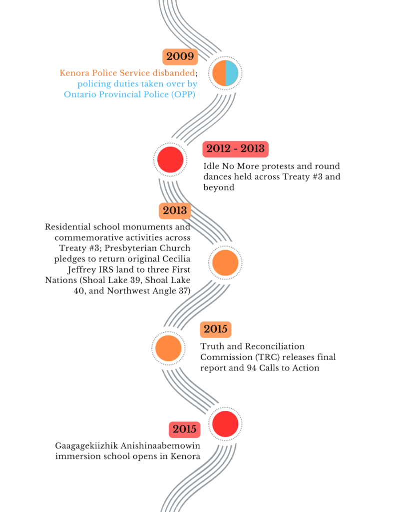 Yet, racial tensions and inequities persisted. A white gang known as the Kenora Indian Beaters targeted Indigenous residents, especially those living on the streets (Jackson, 2021). Nearby, the Grassy Narrows (Asubpeeschoseewagong) and Whitedog (Wabaseemoong) First Nations suffered the effects of mercury poisoning linked to illegal dumping by a paper mill in Dryden (Willow, 2012). In 2002, Grassy Narrows women and youth initiated what became the longest running anti-logging blockade in Canada to protect their lands from clear-cutting and demand mercury justice (Turner, 2023). Meanwhile, hundreds of Indigenous children across Treaty #3 were forcibly removed from their families and adopted out to white households through the Sixties Scoop and Millennium Scoop (Smith, 2013; Vowel, 2016). By the early 2000s, 94% of Indigenous residents in Kenora reported personal experiences of racial discrimination (Urban Aboriginal Task Force, 2007), and tensions escalated after the killing of Anishinaabe man Max Kakegamic on the city’s streets and a series of lawsuits and investigations into local police misconduct (Makin, 2004).