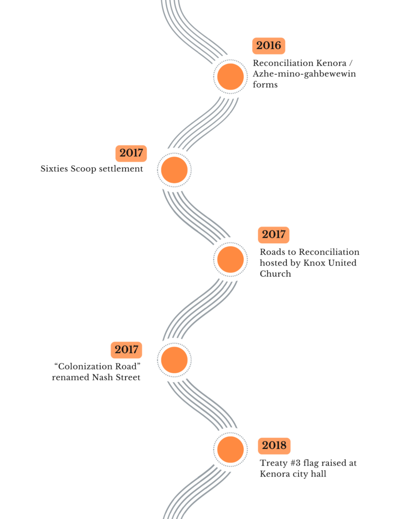 More recently, as this report will highlight, local reconciliation—as well as healing and resurgence—efforts have proliferated. Following the TRC’s (2015) final report, a small group of Indigenous and settler residents formed the non-profit Reconciliation Kenora / Azhe-mino-gahbewewin. Calling for local implementation of the TRC Calls to Action, the group elected a board of directors and adopted a mandate “to undertake and support community initiatives in the Kenora/Treaty 3 Region, which promote reconciliation, … improve relationships between indigenous and non-indigenous people, … and promote education and healing” (Reconciliation Kenora, 2017: np). This research project was launched to help inform their work.
