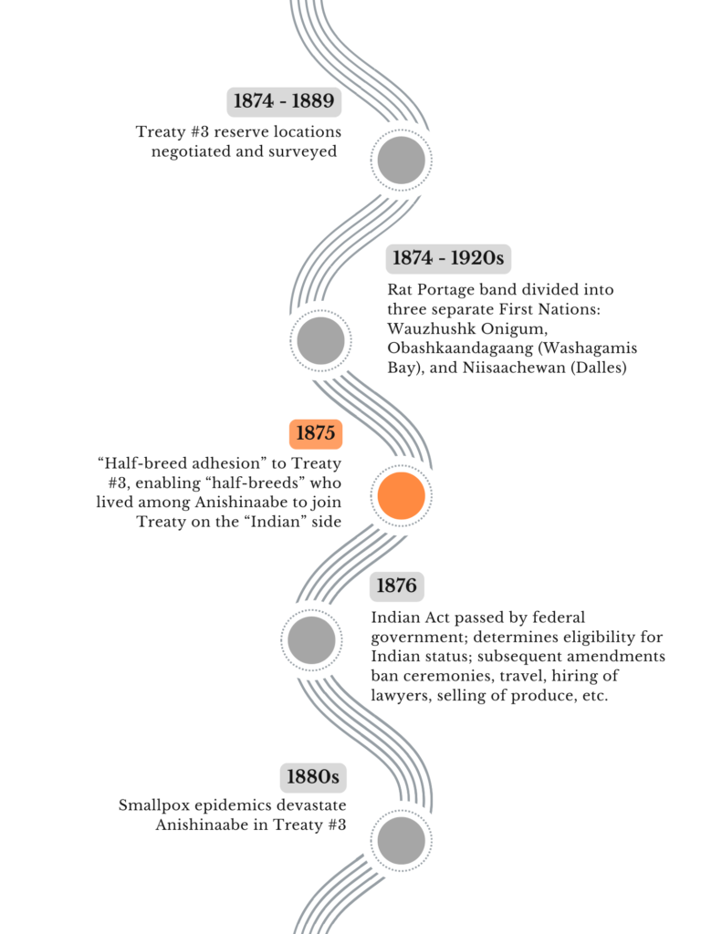The Anishinaabe of this region have long been a powerful independent nation, with their own governance systems, economies, social structures, and vibrant cultural practices (Denis, 2020; Grand Council Treaty #3, 2013, 2023; Luby, 2020; Willow, 2012). After extensive negotiation, the Anishinaabe and the Crown signed Treaty #3 in 1873. While the Anishinaabe viewed the treaty as a peace and friendship agreement between autonomous nations, the Canadian government treated it as a legal “surrender” of 55,000 square miles of land in exchange for much smaller reserves, annuities, and the protection of harvesting rights (Krasowski, 2019; Mainville, 2007).