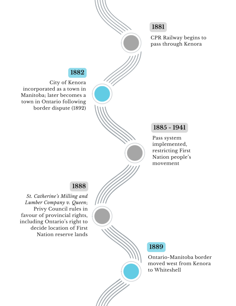 Soon afterwards, settlers and settler governments violated the treaty. In 1876, the federal government imposed the Indian Act on First Nations, seeking to control virtually every aspect of their lives, including identity (‘Indian’ status), marriage, mobility, and voting rights (Joseph, 2018). Across Treaty #3, reserve lands and wild rice beds were flooded, hunting and fishing restrictions were enforced, gold was mined on the Rat Portage (Wauzhushk Onigum) reserve without consent or compensation, Shoal Lake 40 was cut off from the mainland during construction of the Greater Winnipeg Water District aqueduct, and multiple First Nations were forcibly relocated (e.g., Luby, 2020; Perry, 2016; Waisberg et al., 1996). Such actions were upheld by court decisions, such as St. Catharine’s Milling and Lumber Company vs. The Queen (1888), in which the Anishinaabe were labelled “heathens and barbarians,” “rude red men,” and an “inferior race … in an inferior state of civilization” (quoted in Waisberg et al., 1996: 342). In short, the balance of power shifted decisively (Denis, 2020).