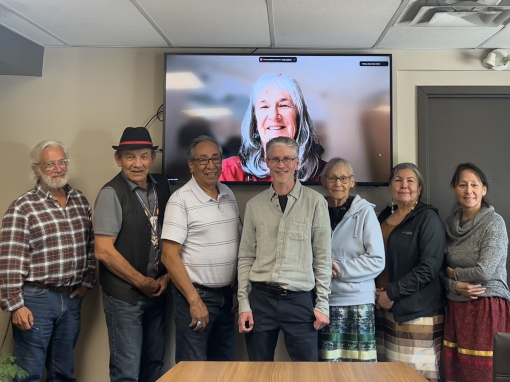 Figure 1: Reconciliation Kenora / Azhe-mino-gahbwewin Elders Circle meeting, June 11, 2025. Left to right front row: Cuyler Cotton, Howard Copenace, Robert Greene, Jeffrey Denis, Jeanette Skead, Sherry Copenace, Kathleen Skead. Back row on computer screen: Mary Alice Smith. [Photo by Daniah Kolur]