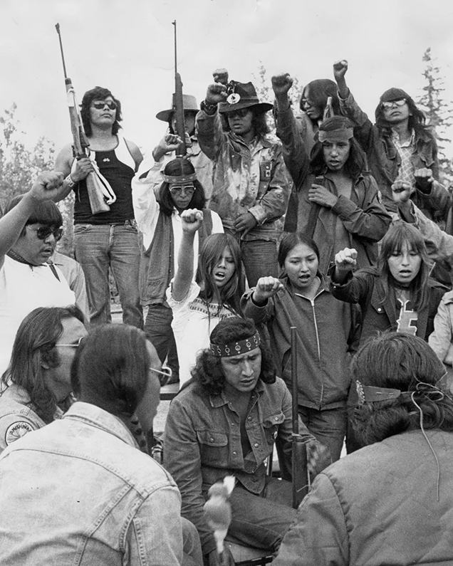 Figure 3: Ojibway Warriors Society (Louis Cameron in the centre) at Anicinabe Park, 1974. [Photo by Canadian Press, reproduced in Harper (1979: 8)]